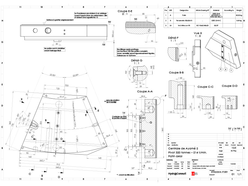 La centrale de Ayamé I est équipée avec 2 groupes Kaplan à axe vertical de 11 MW chacun alors que la centrale de Ayamé II est équipée avec 2 groupes Kaplan à axe vertical de 15 MW chacun. Pour les besoins de l’E&M, deux jeux de patins de pivot, un jeu pour chaque centrale ont été approvisionnés et les prestations de Hydr@Consult ont consisté en :
